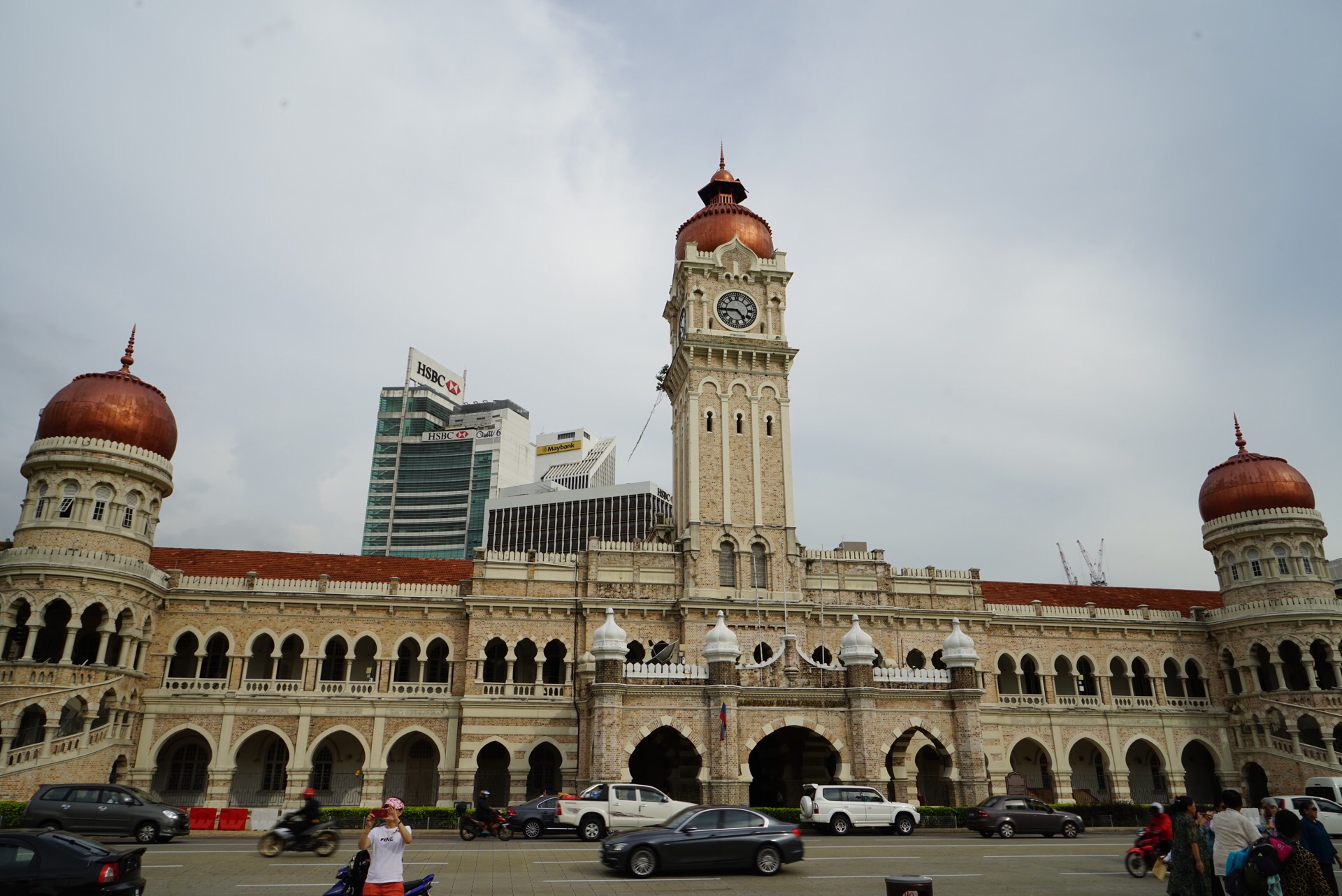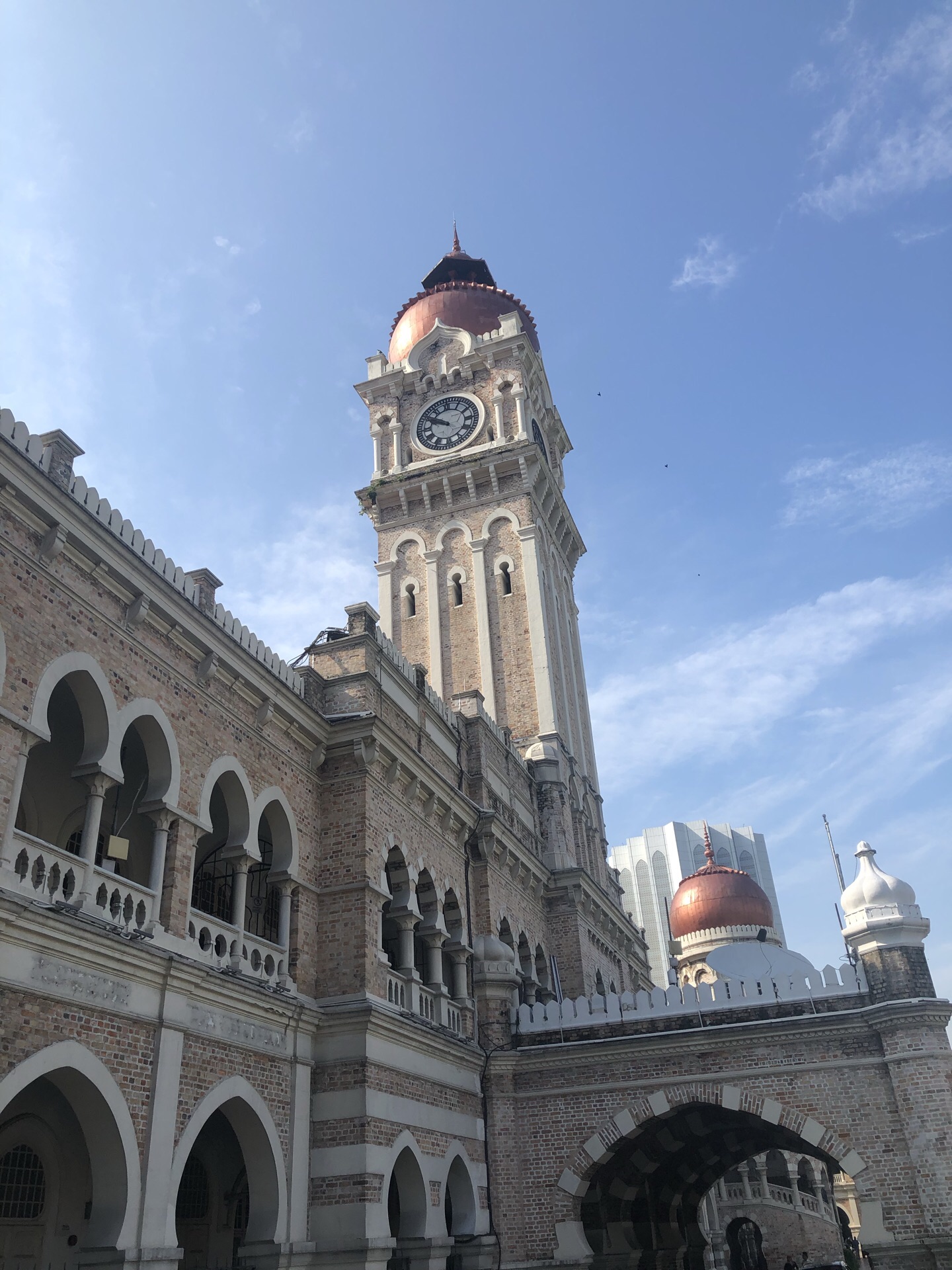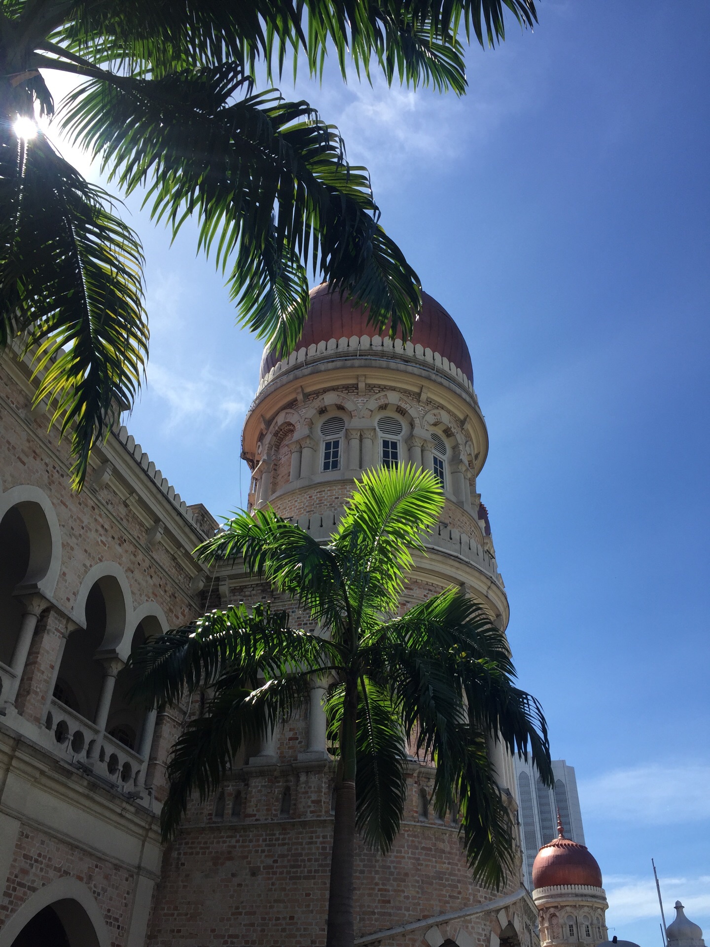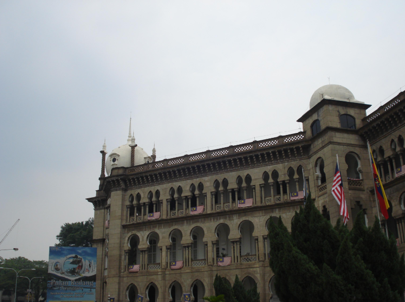 广场的东面是阿都沙曼苏丹大厦(又名苏丹亚都沙高等法院),混合了维多利亚、摩尔等多种风格。这里如今也是高等法院及最高法院所在地,是吉隆坡的标志性建筑。大楼的中央有一个40米高的钟楼,钟楼的造型类似英国的“大本钟”,被称为马来西亚大本钟,但在钟楼的顶部加上一个金色的半球形圆顶。钟楼两侧,各有一个塔楼,顶部也都有金色圆顶。每逢重大庆典,五光十色的彩灯照亮了整个大楼,令人感到这幢楼犹如阿拉伯神话世界中的城堡,雄伟而又有几分神秘。来自各地的游客都在这座颇具特色的大楼前拍照留念。