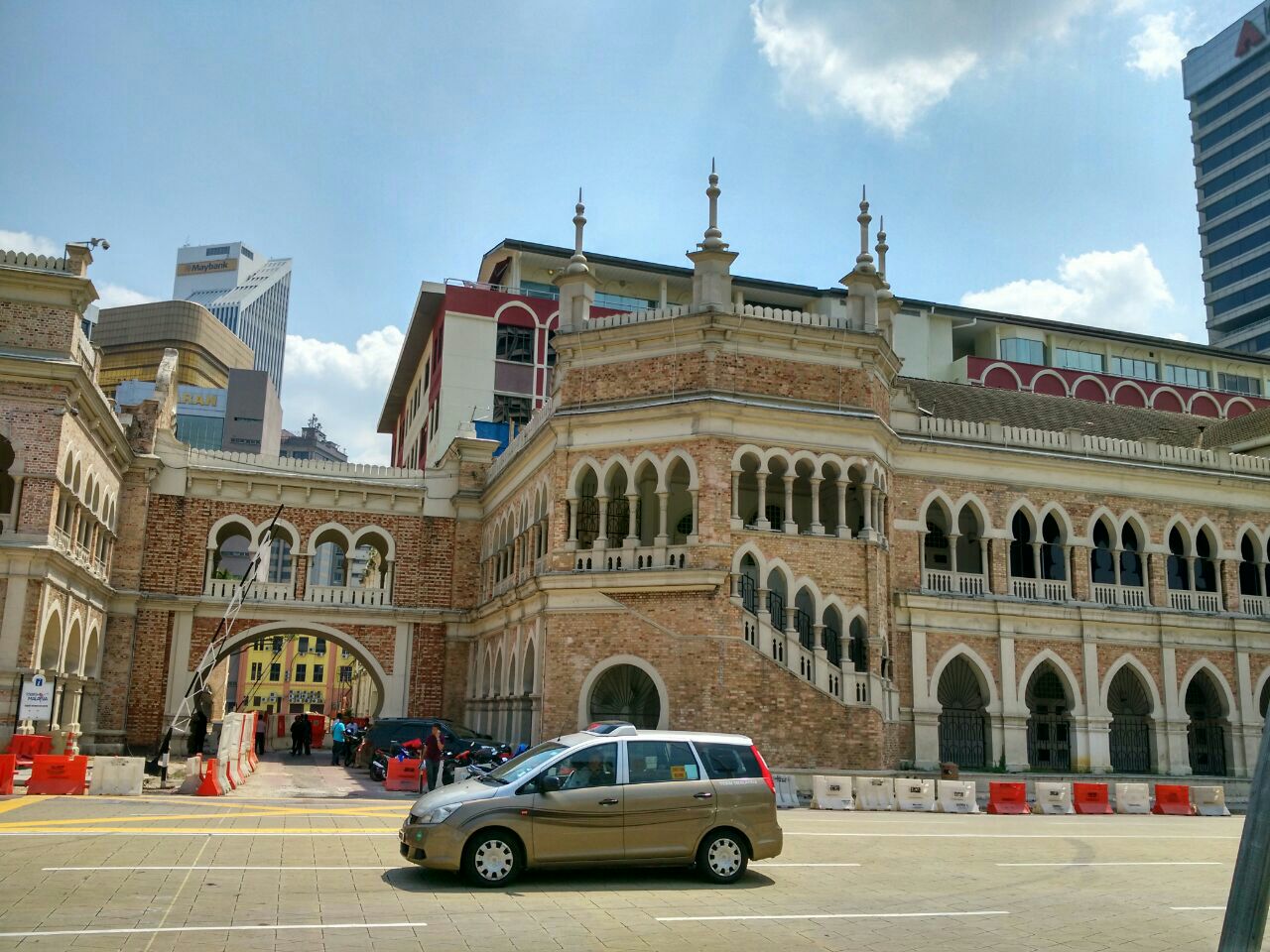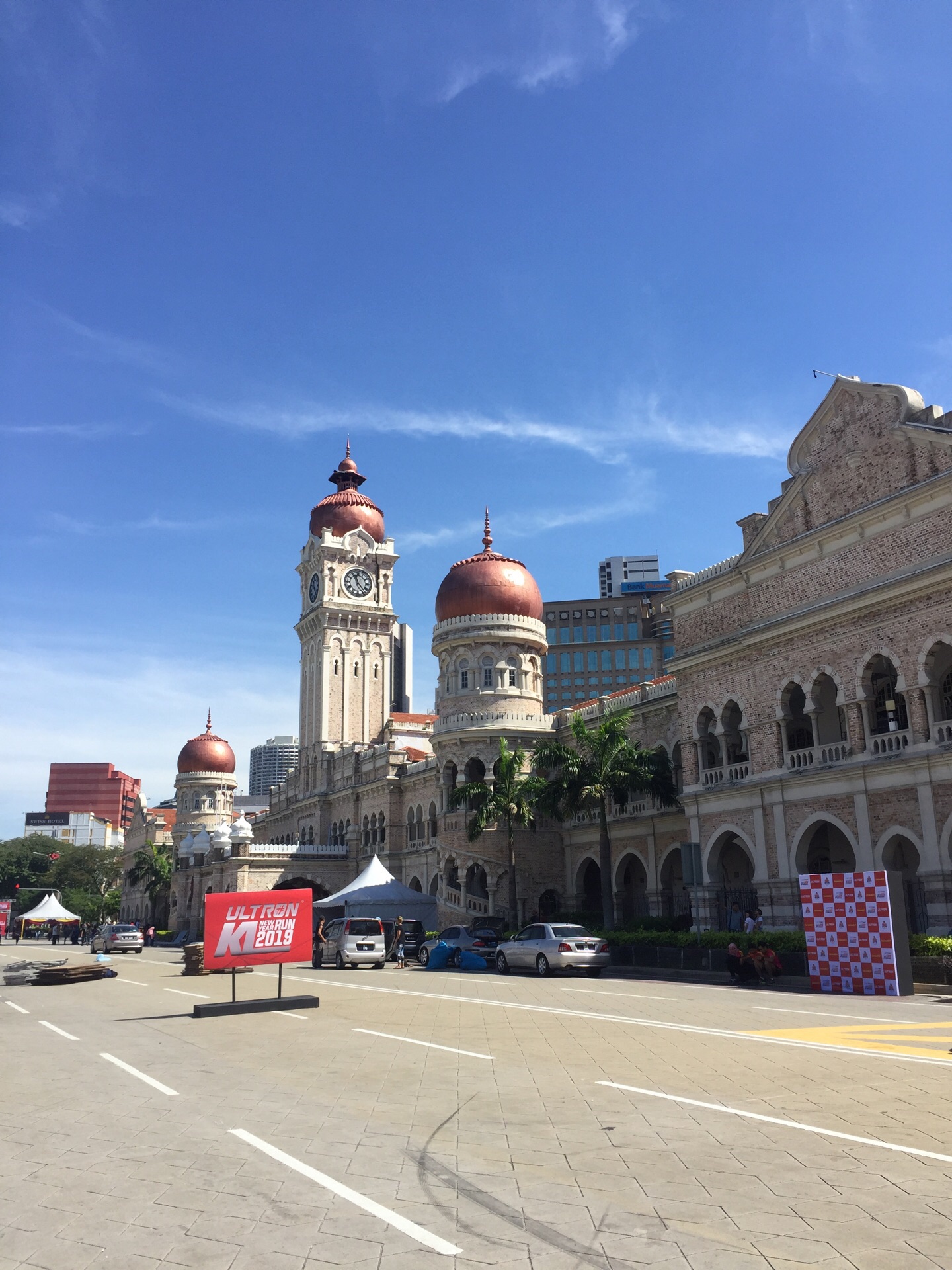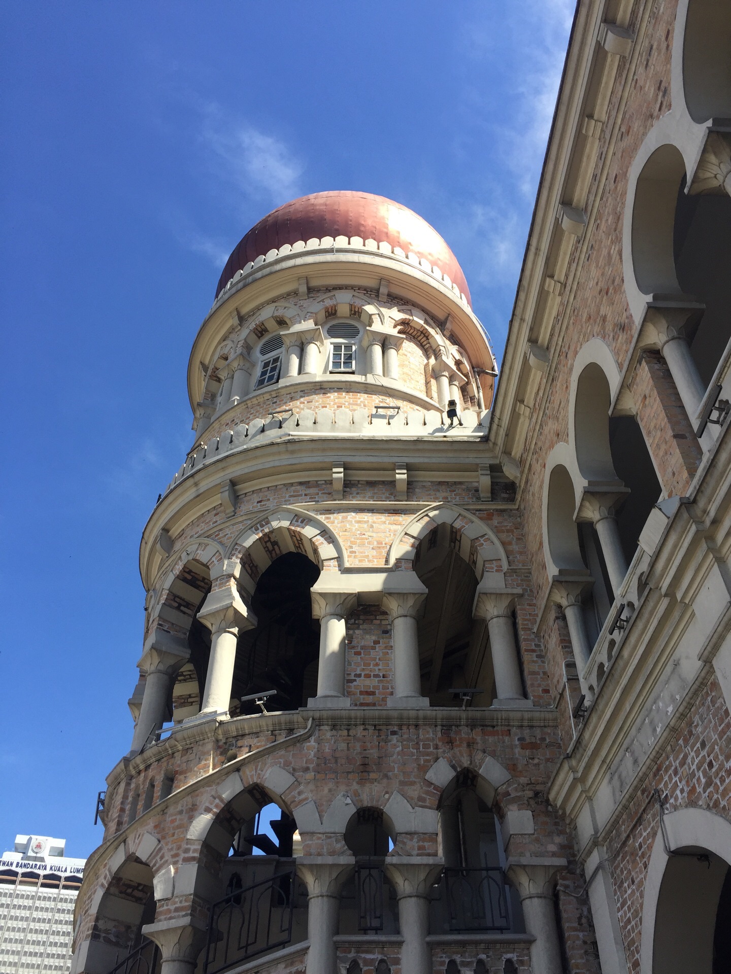 广场的东面是阿都沙曼苏丹大厦(又名苏丹亚都沙高等法院),混合了维多利亚、摩尔等多种风格。这里如今也是高等法院及最高法院所在地,是吉隆坡的标志性建筑。大楼的中央有一个40米高的钟楼,钟楼的造型类似英国的“大本钟”,被称为马来西亚大本钟,但在钟楼的顶部加上一个金色的半球形圆顶。钟楼两侧,各有一个塔楼,顶部也都有金色圆顶。每逢重大庆典,五光十色的彩灯照亮了整个大楼,令人感到这幢楼犹如阿拉伯神话世界中的城堡,雄伟而又有几分神秘。来自各地的游客都在这座颇具特色的大楼前拍照留念。